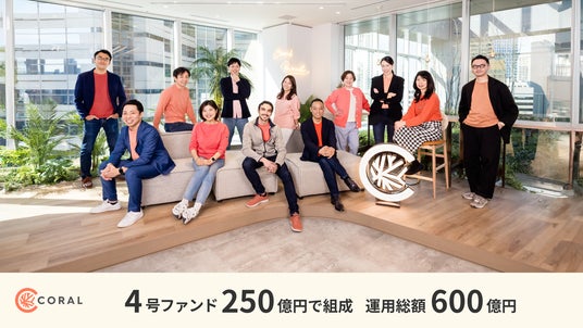 ベンチャーキャピタルのCoral Capital(東京都港区、創業パートナー兼CEO:James Riney)はこの度、4号ファンドを約250億円でファースト&ファイナルクローズしたことをお知らせします。当初の予定調達額200億円からの大幅なオーバーサブスクライブとなります。今回は国内外の機関投資家や財団、ファミリーオフィスなどからご出資いただきました。新ファンド組成完了によって、Coralが運用するファンド総額(AUM)は約600億円にまで拡大しました。