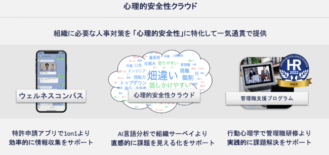 現在はこの管理職トレーニングを取り入れつつ、心理的安全性低下の原因を無意識から見つける「ウェルネスコンパス」と心理的安全性低下の原因を見える化する「心理的安全性クラウド」の3つを提供する新サービス「心理的安全性クラウド」を提供しています。組織の人間関係の問題をPDCAサイクルを回すことで、最新の心理学に基づいて再現性高く、心理的安全性を高めることができるサービスです。詳しくはこちらをご覧ください。https://ps-cloud.mentalcompass.co.jp/