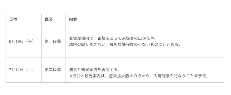 6月1日からの名古屋城の再開園を受け、新型コロナウイルス感染症対策の基本的対処方針等に沿った形で、「徳川家康と服部半蔵忍者隊」の名古屋城における業務を、下記の通り段階的に業務再開をさせることとしましたので、お知らせします。