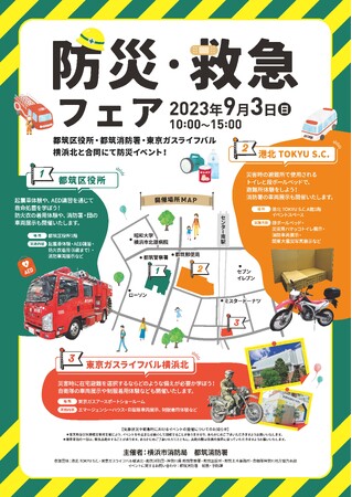 株式会社東急モールズデベロップメント(本社所在地:東京都渋谷区、代表取締役社長:佐々木桃子)が運営する、地域密着型商業施設「港北 TOKYU S.C.」(所在地:神奈川県横浜市都筑区)は、震源地が神奈川県であった関東大震災の発生から100年の節目に、さらに地域の皆さまの防災意識を高めることを目的として、9月3日(日)に、都筑消防署・都筑区役所・東京ガスライフバル横浜北と合同で「防災・救急フェア」を開催します。