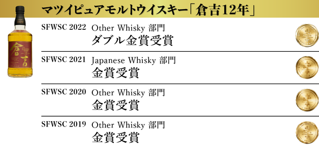 松井酒造合名会社 (以下、倉吉蒸溜所 所在地:鳥取県倉吉市)は、アメリカ最大で世界3大ウイスキー品評会のひとつである San Francisco World Spirits Competiton 2022(以下SFWSC)において『倉吉』を筆頭にマツイウイスキーの8商品が最高賞のダブル金賞を受賞いたしました。(弊社プレスリリースhttps://matsuiwhisky.com/blog/20220209/1223/)
