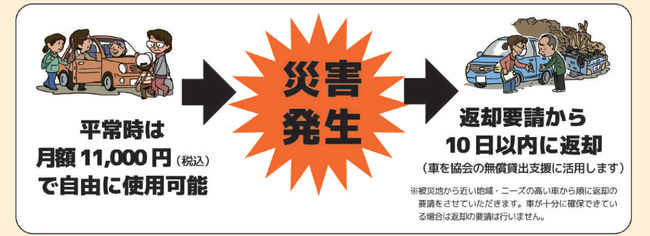 ・災害発生時、返却後、車は被災地に運搬し、被災された方の生活復旧のために無料貸し出しされます。