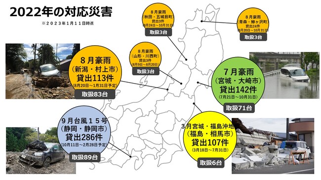 これまで48台の契約実績があり、契約車両は今年発生した自然災害の際に全て返却され、車を被災された方の生活再建