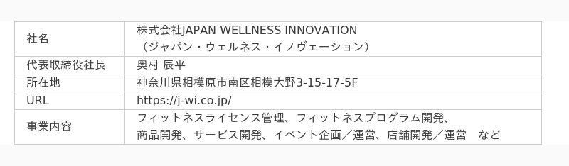 株式会社JAPAN WELLNESS INNOVATIONは「フィットネスで人々を幸せにする」をモットーにフィットネスやウェルネスとの多様な関わりが生まれるような新しい商品やサービスを提供しています。