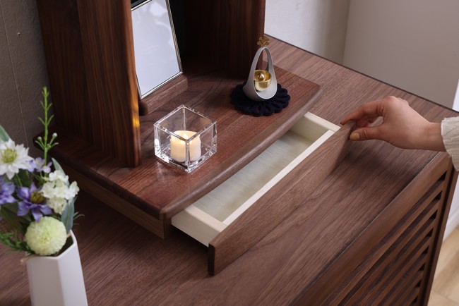 現代の生活スタイルに合わせてコンパクトかつシンプルなデザインの仏壇をお部屋の家具、インテリアとの調和をコンセプトに家具産地大川で制作しました。