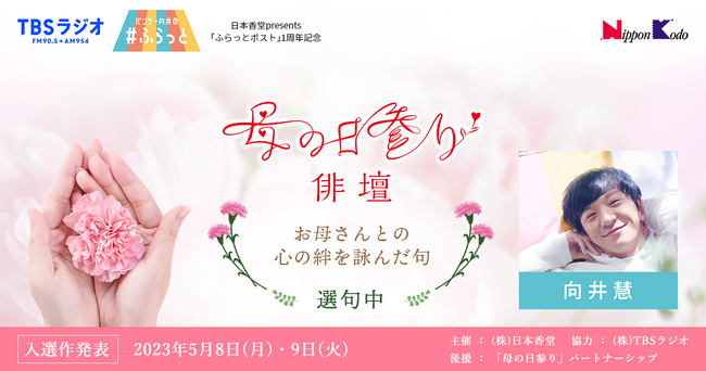 TBSラジオの『パンサー向井の#フラット』(月~金8:30~11:00)では、お母さんと心の絆を題材とした俳句を募集する『母の日参り俳壇』を開催し、5月8日・9日には同番組内で入選者を発表する予定です。