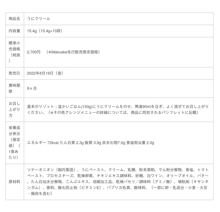 この度、コストコで大人気のフリーズドライ食品シリーズを累計3,600万(※1)食売り上げた、ピルボックスジャパン株式会社(代表取締役社長:栖原徹 以下PILLBOX)は、フリーズドライ新商品「うにクリーム」を 8月19日(金)より応援購入サイト「Makuake」(https://www.makuake.com/project/pillboxjapan-unicream/)にて、先行発売します。