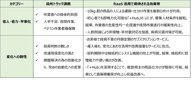 物流ロボティクスサービスを展開するプラスオートメーション株式会社(本社所在地:東京都港区、代表取締役:飯間 卓、以下「+A」)は、静岡県西部地区を中心に物流業を展開する遠州トラック株式会社(本社所在地:静岡県袋井市、代表取締役:澤田邦彦、以下「遠州トラック」)の食品卸向け夜間TC拠点に、t-Sort cb15(可搬重量15kgの仕分けロボット)を活用した投資不要の月額定額制サブスクリプションサービス「RaaS※」(Robotics as a Service)の提供を開始しました。