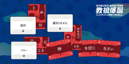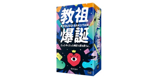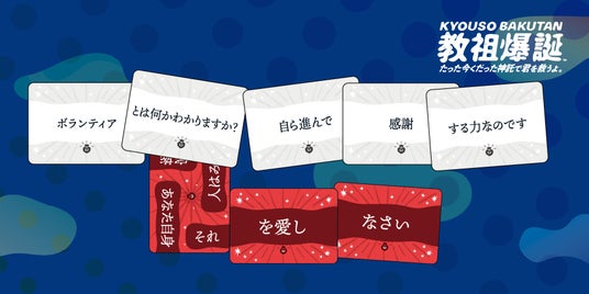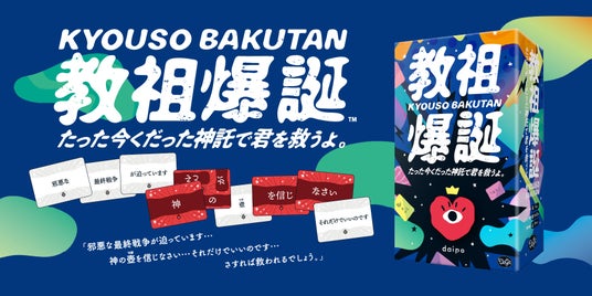 『教祖爆誕 たった今くだった神託で君を救うよ。(以下『教祖爆誕』)』は、シリーズ累計25万部のボードゲーム『たった今考えたプロポーズの言葉を君に捧ぐよ。(以下『今プロ』)』初のスピンオフ作品となります。簡単ルールはそのままに、これまでとは全く異なる世界観を体験できるゲームとなっています。