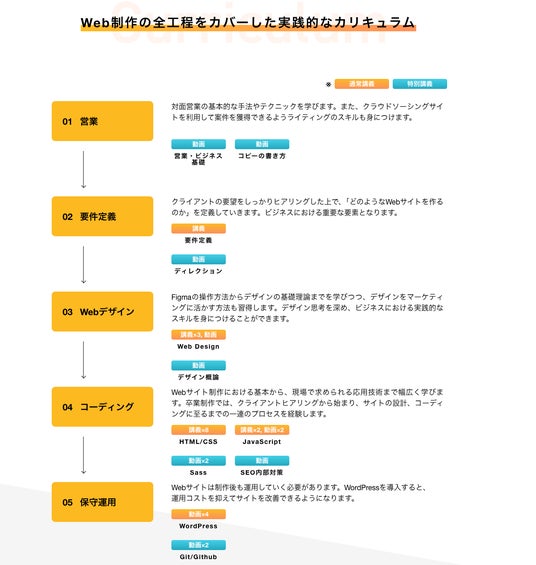 単なるデザインスキルを学習するだけでなく、営業→要件定義→Webデザイン→コーディング→保守運用といったように、Web制作案件を受注してから納品したあとのプロセスまでを一気通貫して学習できるカリキュラムとなっています。