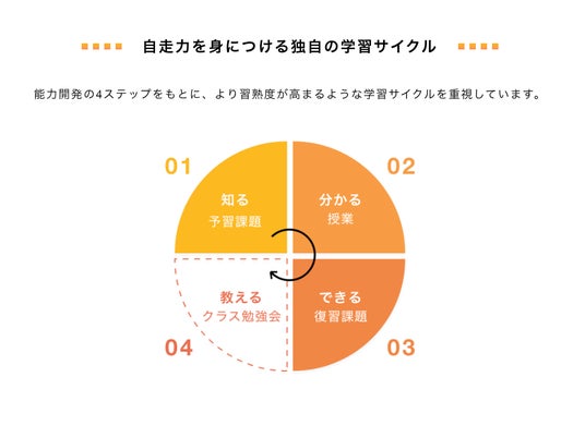 ZeroPlusではこのような挫折を未然に防ぐだけでなく、「知る」「わかる」「できる」「教える」といったサイクルを通して自走力を身につける独自の学習サイクルで授業を展開しています。