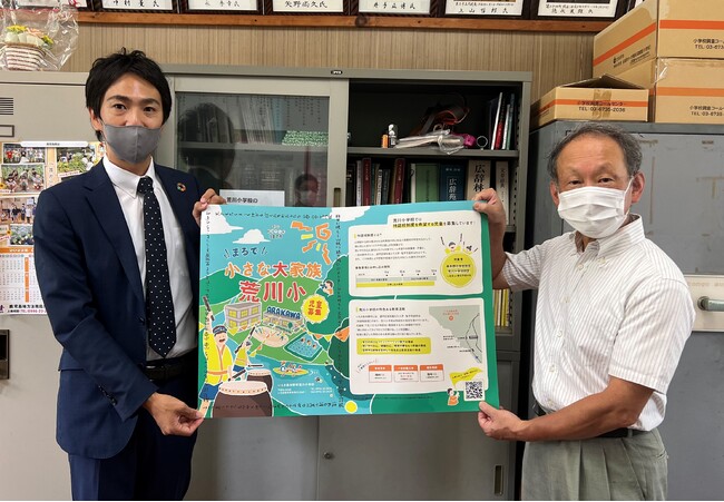 アジア太平洋地域で最大級の独立系再生可能エネルギー事業者(IPP)であるヴィーナ・エナジーは、同社が地域密着型で中山間地域の課題解決を目指し設立した一般社団法人「カザミドリ」を通じ、いちき串木野市立荒川小学校の児童募集の活動支援としてパンフレットおよびポスターを制作し、荒川小学校川崎校長先生へ進呈いたしました。