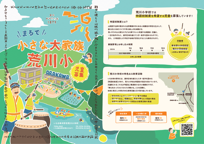 この度、荒川地区の少子高齢化が進み、荒川小学校の存続のためにも、認定校制度を活用し、通学区域外から通学する児童募集を強化したいとの相談を小学校から頂き、広報戦略の立案およびパンフレット・ポスター制作を支援いたしました。