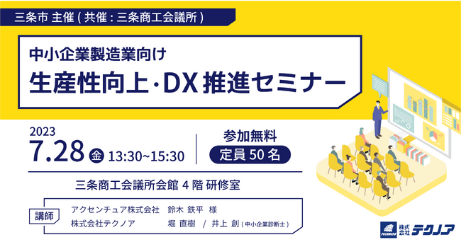 株式会社テクノア(本社:岐阜県岐阜市、代表取締役:山崎 耕治 以下、テクノア)は、2023年7月28日(金)13時30分より三条商工会議所会館(新潟県三条市)で行われる「中小企業製造業向け 生産性向上・DX推進セミナー」に登壇します。