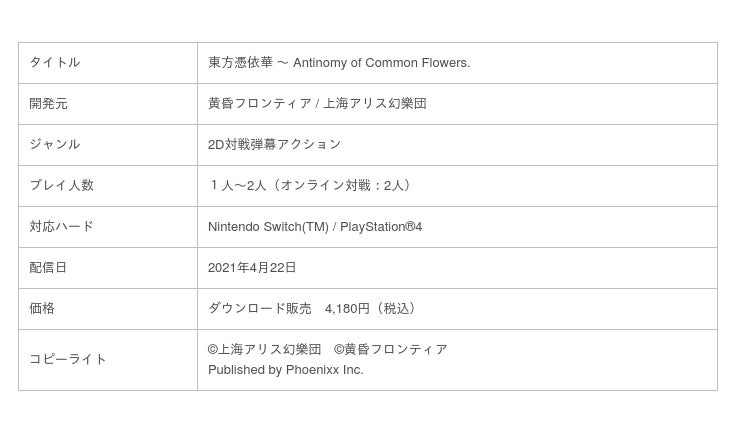株式会社Phoenixx(東京都千代田区、代表取締役社長:坂本 和則)は、「東方Project」の公式作品第15.5弾、原作者ZUN氏監修の元でストーリーが織り込まれ、“黄昏フロンティア”が制作する『東方憑依華 ~ Antinomy of Common Flowers.』 Nintendo Switch(TM)版 / PlayStation(R)️4版の配信日を2021年4月22日に決定し、最新プロモーション映像を本日公開したことをお知らせいたします。