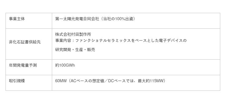 当社の連結子会社である第一太陽光発電合同会社は、新規に開発する太陽光発電所において発電した電力由来の環境価値を、株式会社村田製作所(以下「村田製作所」と言います。)に非FIT非化石証書として直接販売する環境価値売買契約(以下「バーチャルPPA」と言います。)を締結し、発効いたしましたのでお知らせいたします。