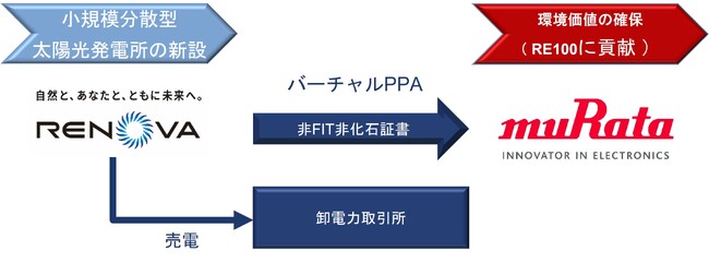 このたび、当社グループとしては初めてとなる、当社グループが保有する再生可能エネルギー発電所由来の非FIT非化石証書を長期間にわたり販売する契約を、RE100に取り組む村田製作所と締結いたしました。本契約に基づき販売する非FIT非化石証書は、当社が新規に開発する追加性のある小規模分散型太陽光発電所由来となります。また、本取引にて発電した電力は卸電力取引所に売電します。