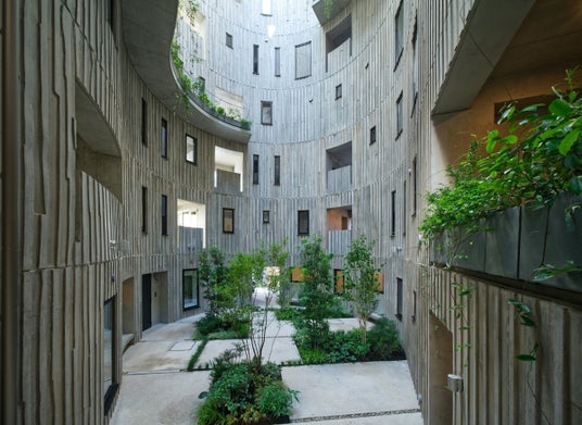 東京・湯島の住宅街にある賃貸集合住宅。3方向を高層建物に囲まれた旗竿敷地に、中庭を囲む自由曲線の平面計画により、計35戸の各住戸が異なる魅力を享受できるように計画された。2023年夏に数日間行われた関係者見学会では、SNS上で見学者の感嘆の声が広く拡散された。