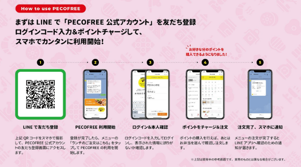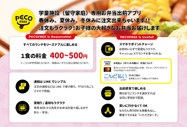 ペコフリーは施設単位の導入決定から開始できる。ペコフリーを利用したい日の栄養士監修のランチを注文期日までにLINE上のLINEミニアプリで予約注文すると、当日、施設に設置された受取り・返却BOXに弁当が配送されます。1食(弁当)あたり400~500円(税込)で、保護者様がチャージしたポイントから支払われます。