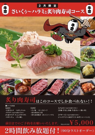 2月限定の「さいくぅ~ハラミと炙り肉寿司コース(5,000円 税別)」は、通常メニューにはない人気の【炙り肉寿司】が食べられる、焼肉ファンに捧げる1カ月のみのスペシャルコース。