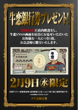 2月9日(水)に配布されるサービス券("牛恋銀行券")を使えば、次回来店時には、実質無料でこれらのメニューを楽しむことも可能に!