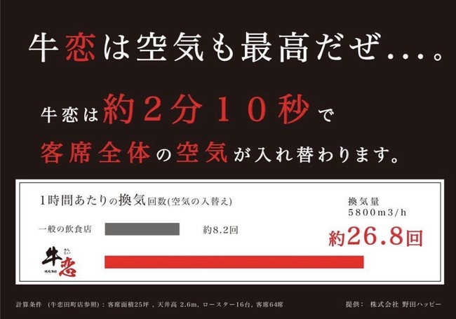 牛恋各店舗では、最高水準のロースターの排気システムを各テーブルに完備。感染症対策の一環として、抜群の店内換気システムが備えられています。平均2分10秒で客席全体の空気が入れ替わり、焼肉店としての設備自体が、感染拡大防止対策の役割を果たしています。また、お客様ならびに従業員の健康と安全確保、新型コロナウイルス感染拡大防止の観点から、手洗いの徹底・マスクの着用や検温実施、会計のキャッシュレス化推奨、細目な清掃・消毒と換気等の対策を万全にしております。