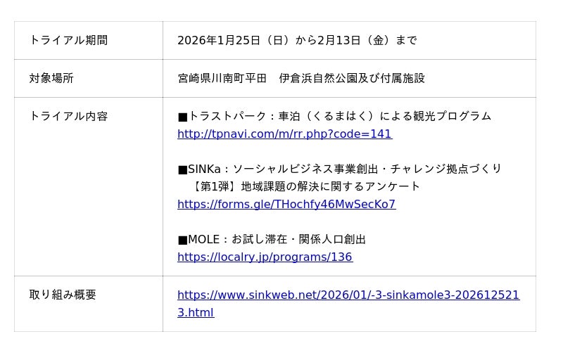 宮崎県川南町では、伊倉浜自然公園及び付属施設における「トライアル・サウンディング」の一環として、一般社団法人SINKa様、トラストパーク株式会社様と共同での実証実験を開始しました。