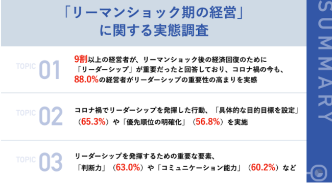9割以上の経営者が、リーマンショック後の経済回復のために「リーダーシップ」が重要だったと回答