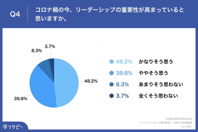 「Q4.コロナ禍の今、リーダーシップの重要性が高まっていると思いますか。」(n=108)と質問したところ、「かなりそう思う」が48.2%、「ややそう思う」が39.8%という回答となりました。