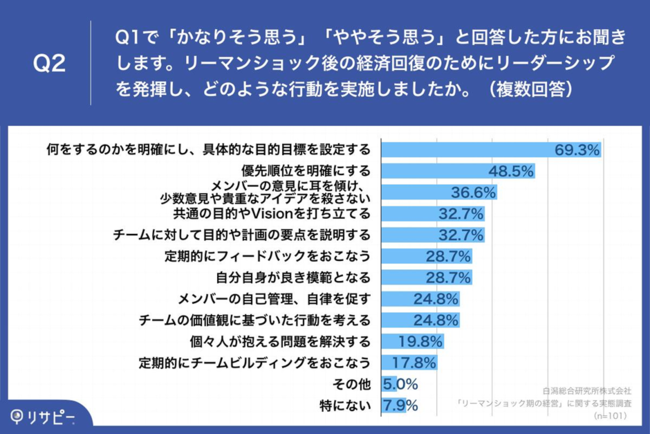 Q1で「かなりそう思う」「ややそう思う」と回答した方に、「Q2.リーマンショック後の経済回復のためにリーダーシップを発揮し、どのような行動を実施しましたか。(複数回答)」(n=101)と質問したところ、「何をするのかを明確にし、具体的な目的目標を設定する」が69.3%、「優先順位を明確にする」が48.5%、「メンバーの意見に耳を傾け、少数意見や貴重なアイデアを殺さない」が36.6%という回答となりました。