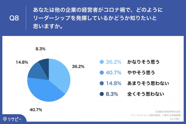 「Q8.あなたは他の企業の経営者がコロナ禍で、どのようにリーダーシップを発揮しているかどうか知りたいと思いますか。」(n=108)と質問したところ、「かなりそう思う」が36.2%、「ややそう思う」が40.7%という回答となりました。