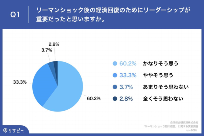 「Q1.リーマンショック後の経済回復のためにリーダーシップが重要だったと思いますか。」(n=108)と質問したところ、「かなりそう思う」が60.2%、「ややそう思う」が33.3%という回答となりました。