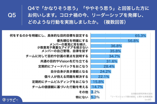 Q4で「かなりそう思う」「ややそう思う」と回答した方に、「Q5.コロナ禍の今、リーダーシップを発揮し、どのような行動を実施しましたか。(複数回答)」(n=95)と質問したところ、「何をするのかを明確にし、具体的な目的目標を設定する」が65.3%、「優先順位を明確にする」が56.8%、「メンバーの意見に耳を傾け、少数意見や貴重なアイデアを殺さない」が36.8%という回答となりました。