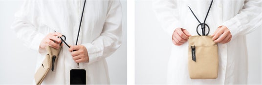 一見ポシェットに見えますが、実は斜め掛けストラップにポーチをひっかけるというアイデア。ストラップにつけても外しても使えるのがポイントです。