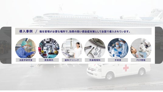 今回の感染症対策では、医療現場での感染予防のために開発された3種の触媒反応を利用した抗菌製品を使用しています。その有効性と安全性から、救急車両をはじめとする警察・消防などの災害救助の現場において、効果の高い感染症対策として全国で導入されています。