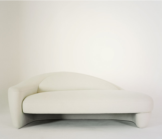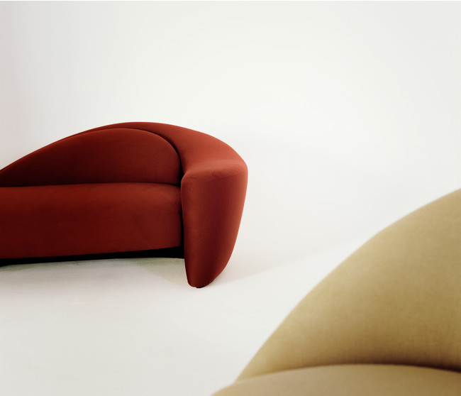 長椅子を現代的に解釈したパームデュエット・シェーズロング。ゆったりと広めにデザインされたアームレストには、もう一人座ることもできます。シェーズロングに合わせたややアシンメトリーなオットマンもあります。このオットマンは、シェーズロングのアームにもたれてくつろぐ際に、伸ばした脚を理想的にサポートするようにデザインされていますが、もう一人がオットマンに座り、語らいのときを過ごすこともできます。意外性のあるダイナミックなフォルムで、直線的なラインと曲線が絶妙なバランスで組み合わされています。キャッシュファー(編み機で編んだ非常に柔らかいカシミヤとシルクの混紡ファブリック)とコネマラ・リネンで提案。