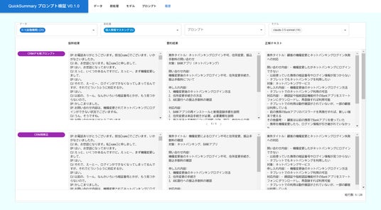 プロンプト検証機能は、ツール上からノーコードでプロンプトを作成し、要約結果を比較検証できる機能です。音声認識テキスト、作成したプロンプト、利用したいモデルをツール上で設定すると、実際にQuickSummary2.0で出力される要約結果を確認しながらプロンプトチューニングを行うことができます。
