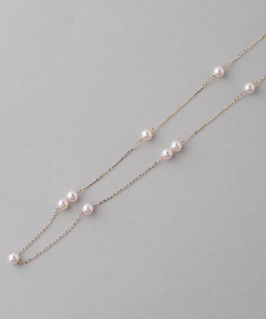 カジュアルにもフォーマルにも合わせやすいパールネックレスは1本持っていると重宝するアイテムです。 点々とパールを紡いだステーションデザインが遊び心のあるデコルテを演出します。