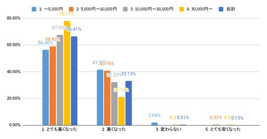 ・物量減および価格高騰について、高価格帯の店舗ほど強く感じると回答