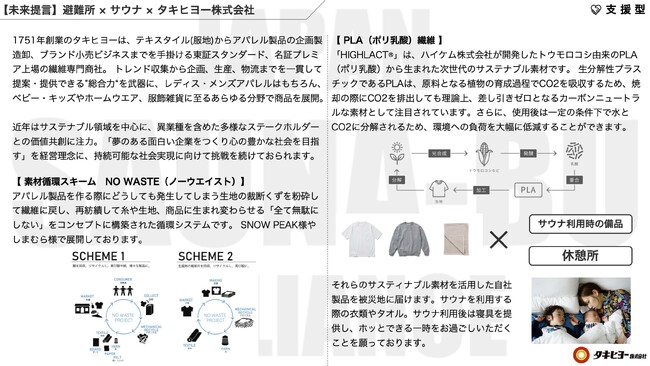 未来提言では、参加企業それぞれが自社製品やサービスなどで実現できる取り組みを自由に提案し、当社はオリジナルの素材循環スキーム「NO WASTE(ノー ウエイスト)」や次世代のサステナブル素材PLA(ポリ乳酸)繊維「HIGHLACT(R)(ハイラクト(R))」を使用した避難所生活でもホッとできるひと時を過ごすための商品の提案を行いました。
