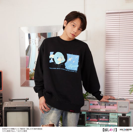 左(男性モデル):TVアニメ『【推しの子】』第1弾 レトロポップTシャツ 2(アクア)、右(女性モデル):TVアニメ『【推しの子】』第1弾 レトロポップスウェット 3(ルビー)