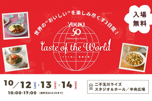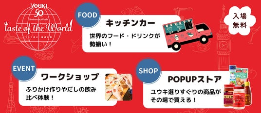 世界各国の調味料や食材を幅広く取り扱うユウキ食品株式会社(本社:東京都調布市富士見町1-2-2、代表取締役社長:田中秀和)は、創業50周年を迎え日頃のご愛顧に感謝し、“世界のおいしい味”を様々な形で楽しんで頂けるイベントを開催します。YOUKIの商品を使ったクッキングステージやワークショップ(ふりかけ手作り体験や、だしの飲み比べ体験)、そしてキッチンカーでは世界の美味しいフードやドリンクが勢揃い!