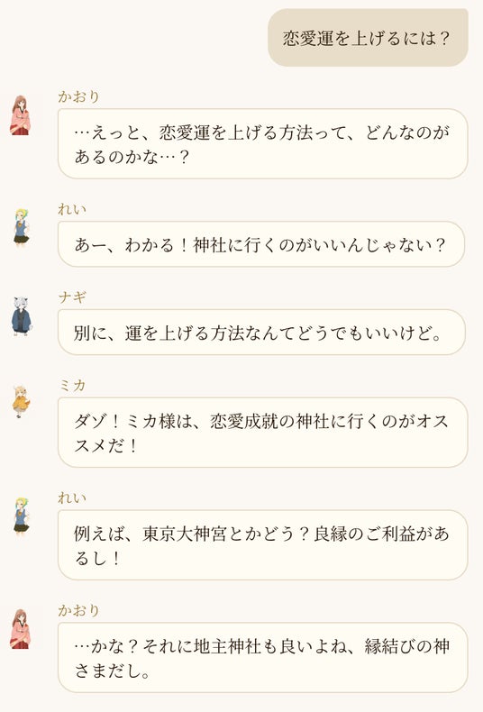 キャラクターと対話する中で、悩みに即した神社仏閣を探すことができる。