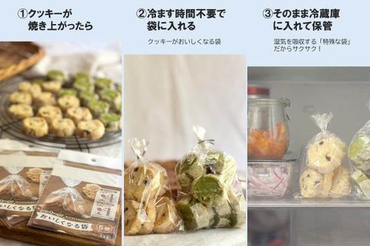 2.焼きあがったら、冷ます時間を省略して、「クッキーがおいしくなる袋」に入れて密封