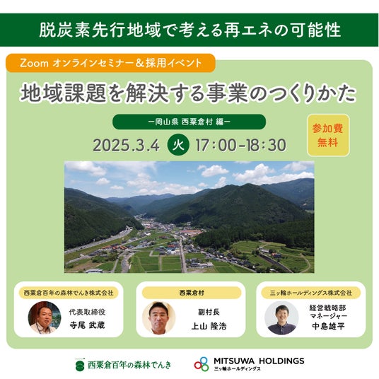 三ッ輪ホールディングス株式会社(本社:東京都新宿区、代表取締役社長:尾日向竹信、以下「当社」)は、当社を含む民間企業複数社と岡山県西粟倉村との共同出資により設立した新電力会社「西粟倉百年の森林でんき株式会社」(本社:岡山県西粟倉村、代表取締役:寺尾武蔵、以下「百森でんき」)との共同ウェビナー「地域課題を解決する事業のつくりかた(岡山県西粟倉村編)」を2025年3月4日に開催いたしました。地域経済の活性化や地方創生に関心を持つ企業・自治体関係者などが参加し、西粟倉村および百森でんきの取り組み事例をもとに、地域資源を活かした事業創出の可能性について議論しました。