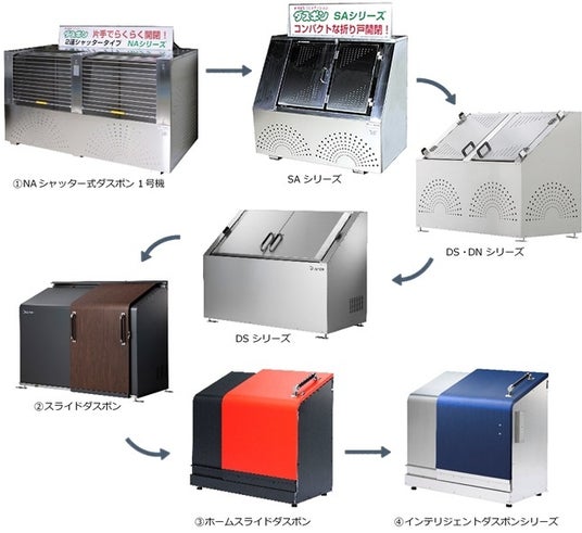 当社は、顧客からオーダーを受けた金属製品の加工・製造をおこなう下請けメーカーでした。平成7年、地元の町内会長から、町内のゴミ集積庫について、「扉や本体が錆びつき重くて危ない上に、3~5年ごとに塗装をし直さなければならない、とにかくカラスの散らかし被害が大変なので何とか解決できるゴミ庫を考えてほしい」との相談を受けました。これを機に、塗装が不要なオールステンレス製でカラス対策万全の安心安全に利用できるゴミステーション「NAシャッター式ダスポン1号機」が完成しました(参考資料1.)。導入した町内からカラスがいなくったのをきっかけに他の町内でも導入し、大変好評でメディアでも取り上げられるなど大きな反響を呼ぶことができました。ちなみに、ダスポンの名称は「ダストボックスにポン」を略して名付けられました。