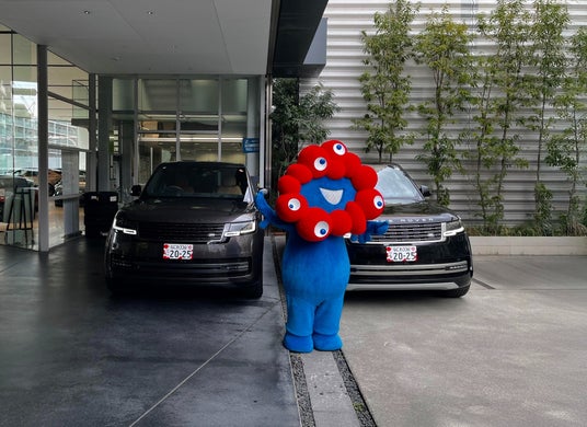 大阪・関西万博に提供されるレンジローバー。万博公式キャラクターのミャクミャクと