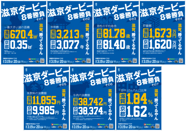 今回の滋京ダービーを盛り上げるために、“滋賀人の誇りと勝利への渇望”にスイッチを入れるために、とにかく滋賀が京都に勝っているものを集め、7パターンのポスターデザインに表現いたしました。