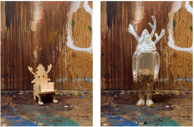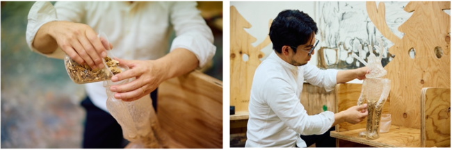 今回のイベントのメインピースである透明のソフビの内部にあるゴールドの粒は、廃棄物からできています。昨今、持続化可能社会やリサイクルの重要性を感じさせられる場面が増えてきていると思います。それは、社会生活の強制的な使命になっていると言っていかもしれません。もちろん資源は有限で、環境汚染は防ぐべきものではありますが、今の状況は少しネガティブすぎるのではないかと僕は感じます。なぜ廃棄物が発生するのか。それは僕たちがより便利で心地よい生活を求めたからだと思います。廃棄物は僕たちの営みの証。進化と発展の成果。今の状況は、そんなに悪いもんじゃない。これから始めれば良いと思います。