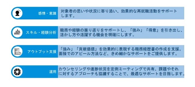 候補者に対してコンサルティング(キャリアカンセリング・研修・面接対策など)を行い、再就職先の斡旋をします。